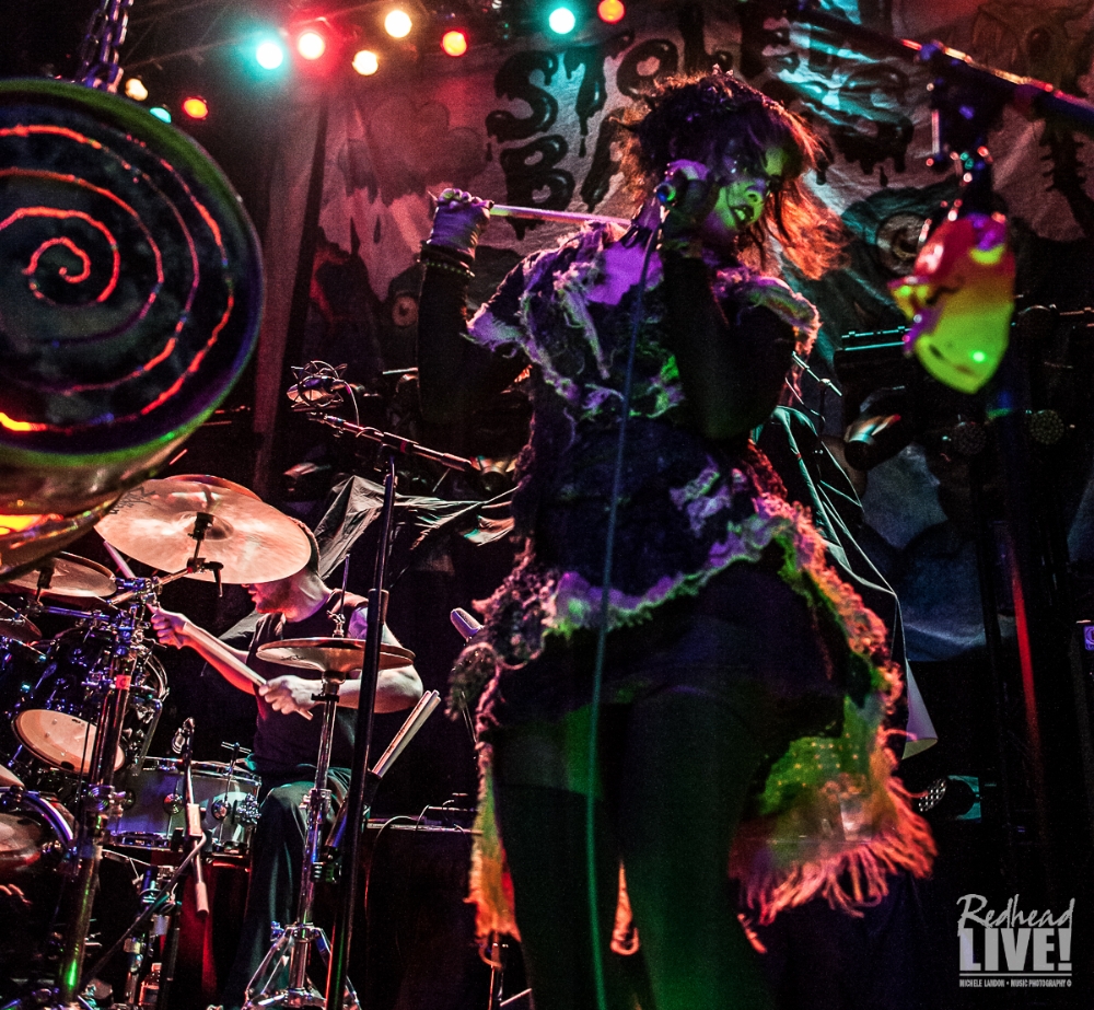 At about 8PM the opening band Stolen Babies of Los Angeles / Oakland CA took to the stage. The trio is self labeled as “experimental rock,” which I think fits perfectly. They have two albums under their belt; “There Be Squabbles Ahead” released in 2006 and “Naught” in 2012 with a hiatus in-between the band is now hitting the road. I won’t put my own label on the sound because I wouldn’t be able to hit it correctly. I heard hard rock, sultry-bluesy sounds, screamo and even a taste of the ’80s New Wave. Dominiques voice was dark, intense with fun thrown in too. See the accordion? “Splatter” from “Naught” was one of my favorites. The lighting was black light with fluorescent paint and a carnival mad house feel, a challenge to shoot. The makeup around her eyes really played with my mind. The way the lights and fluorescent paint shined on them as well as her accordion and hanging drum at center stage. The band trio consists of Dominique Lenore Persi (vocals, accordion) and twin brothers Gil Sharone (drums) and Rani Sharone (bass). If you get a chance, pull them up on stolenbabiestheband.com and listen to their very unique sound and don’t forget to play Splatter!