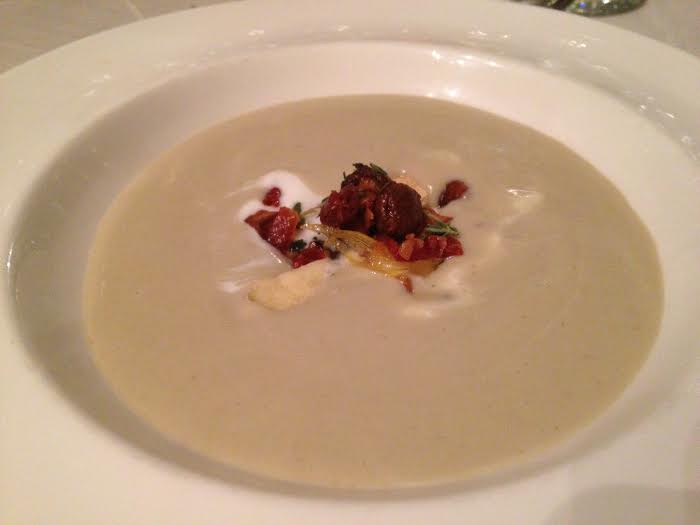 Our second course prepared by Chef John Suley was Artichoke Veloute, Prosciutto, Chanterelle Mushrooms, Yogurt, Sourdough Croutons, and Lemon Thyme. Honestly I think this the best soup I’ve ever had in my entire life! I wanted 4 more bowls full, unfortunately I couldn’t even lick the bowl with 9 other people sitting at the table. 😉 The Veloute was served with a 2012 Reyneke Sauvignon Blanc and 2011 Tenuta II Corno Chianti Colli Fiorentini Foss’A Spina DOCG. The Sauvignon Blanc is a South African Organic wine. South Africa has the oldest soils in the universe and the vines are obviously deeply in love with the soil! The grapes and vines of this vineyard face the ocean and rest in french barrels for 15 months.