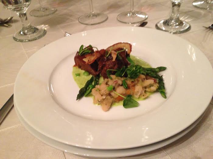 We proceeded into the dinning room, where we anxiously awaited each course prepared by various chefs and paired with palette-pleasing wines. Our first course of Crispy Fried Sweetbreads, Roast Pork Belly and Rhubarb Butter was served with 2004 Paillard Champagne Vintage Bouzy Grand Cru and 2010 Le Cadeau Cote Est Pinot Noir. The winemaker’s family has been making wine for over 200 years, allowing this champagne to be barreled for 8 years before serving!
